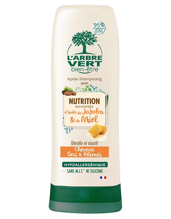 L’après shampooing nourrissant L’Arbre Vert à l’huile de jojoba et miel, connus pour leurs bienfaits nourrissants, nourrit et démêle vos cheveux, en plus de les rendre plus doux, plus souples et plus éclatants.